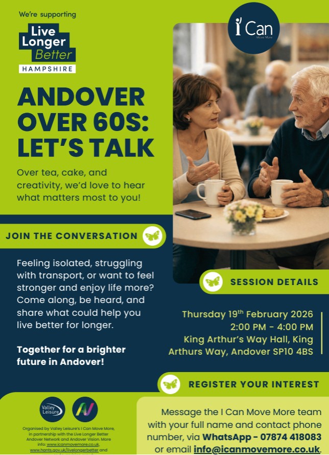 Feeling isolated, struggling with transport, or want to feel stronger and enjoy life more? Come along, be heard, and share what could help you live long better over tea, cake, and creativity, we'd love to hear what matters most to you! Register your interest - Message the I Can Move team, with your full name and contact phone number, via Whatsapp - 07874 418083 or email info@icanmovemore.co.uk Together for a brighter future in Andover!