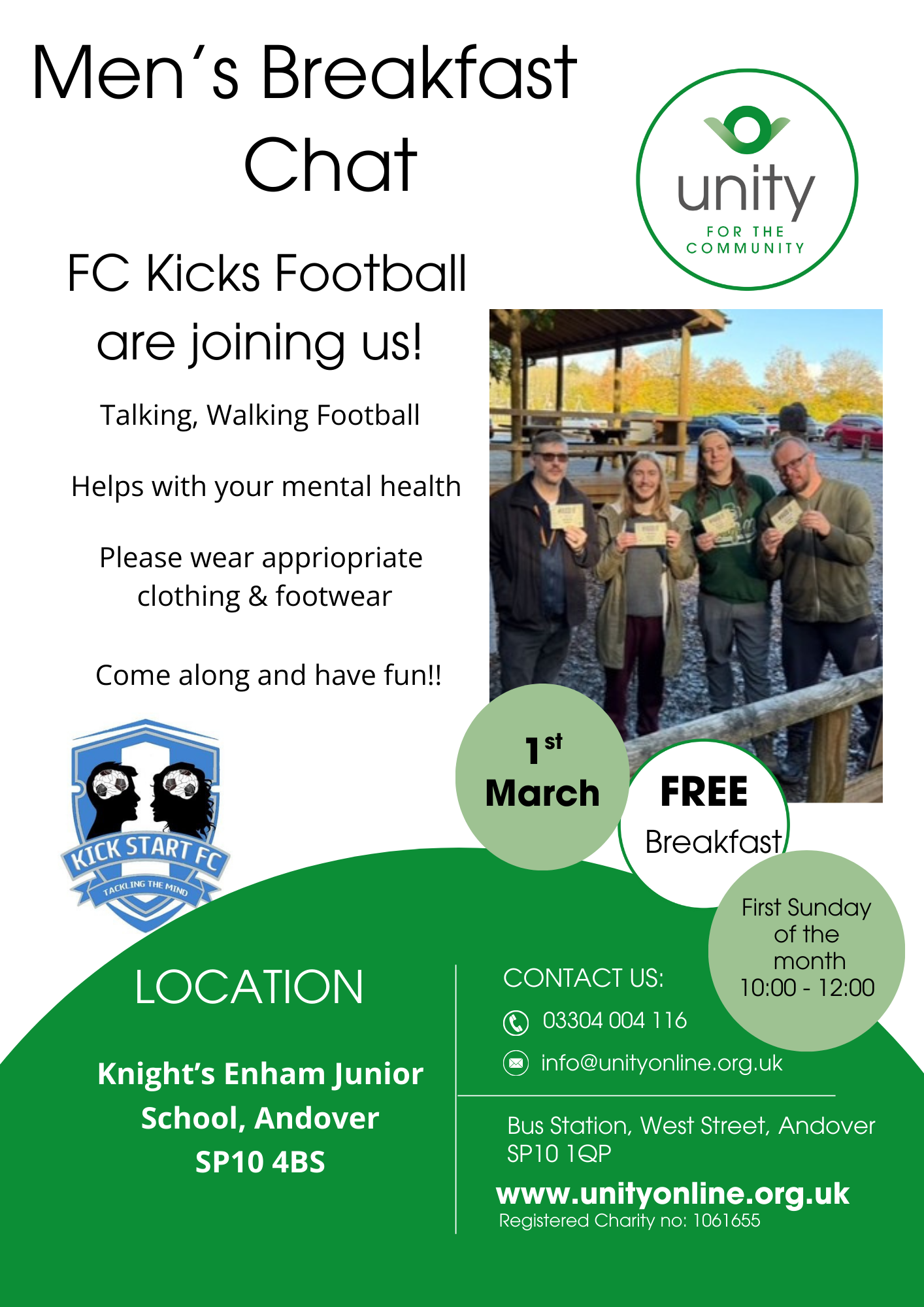 This month at the men's breakfast chat we are welcoming 'FC Kicks Football'. Come have a kick around, some fun and a FREE breakfast. No need to book just turn up on the day, in suitable attire. If you do not want to kick about football, that is ok, enjoy good food and company. All men welcome.